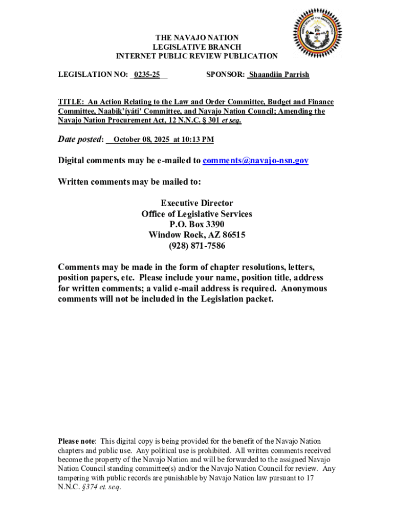The Navajo Nation Procurement Code governs the procurement practices and procedures, establishing rules that regulate the acquisition of goods and services. The code sets forth clear guidelines on bidding processes, contract formation, and award criteria.