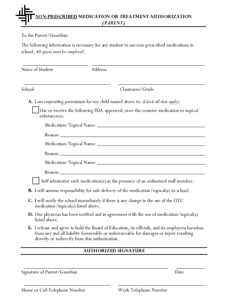 Get the free Non-prescribed Medication or Treatment Authorization