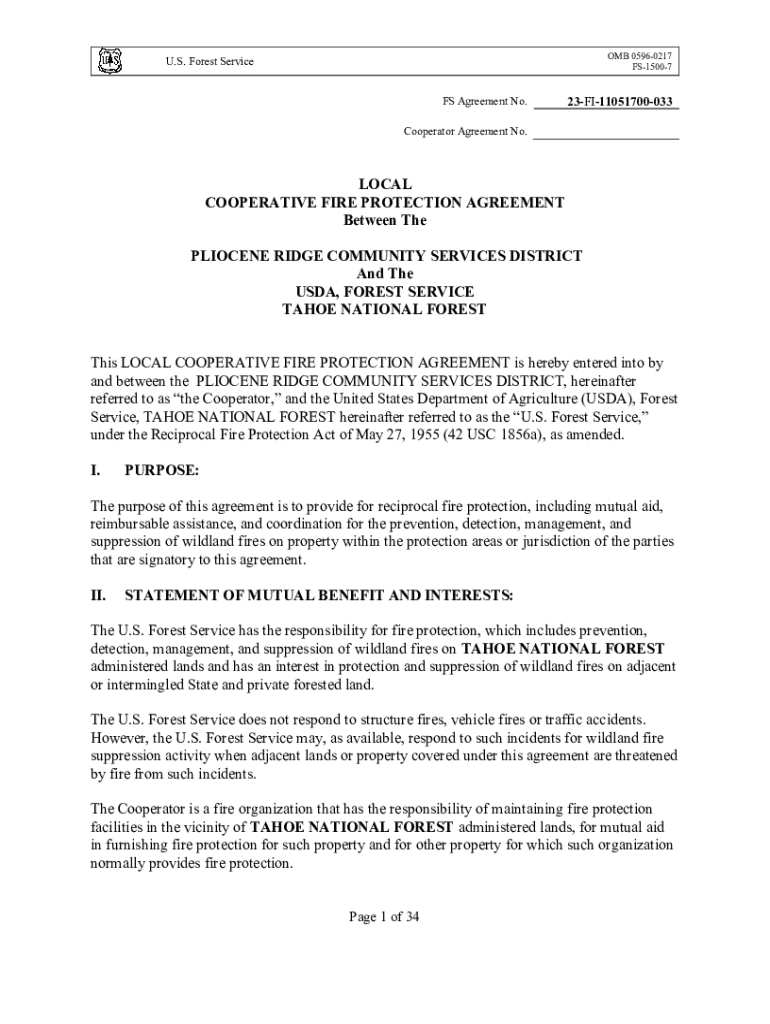 This document outlines the Local Cooperative Fire Protection Agreement between the Pliocene Ridge Community Services District and the USDA Forest Service for the mutual coordination of fire protection