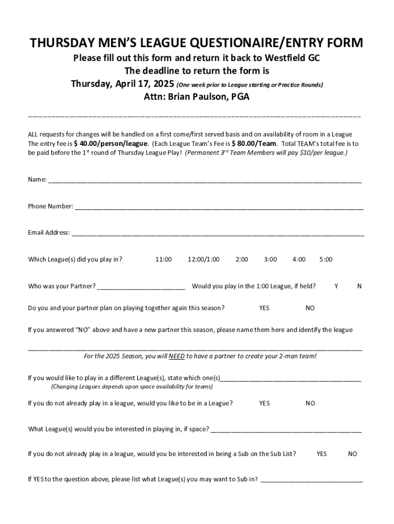 The Thursday Men's League Questionnaire Entry Form is the first step for new and returning players to join the league. This form serves multiple purposes, including gathering essential information about each participant, streamlining the registration process, and ensuring that teams are balanced according to skill level.