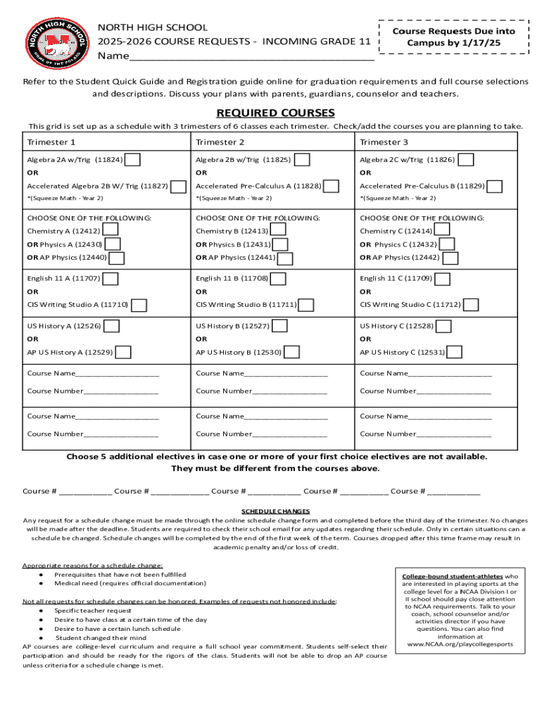 Get the free North High School 2025-2026 Course Requests - Incoming Grade 11