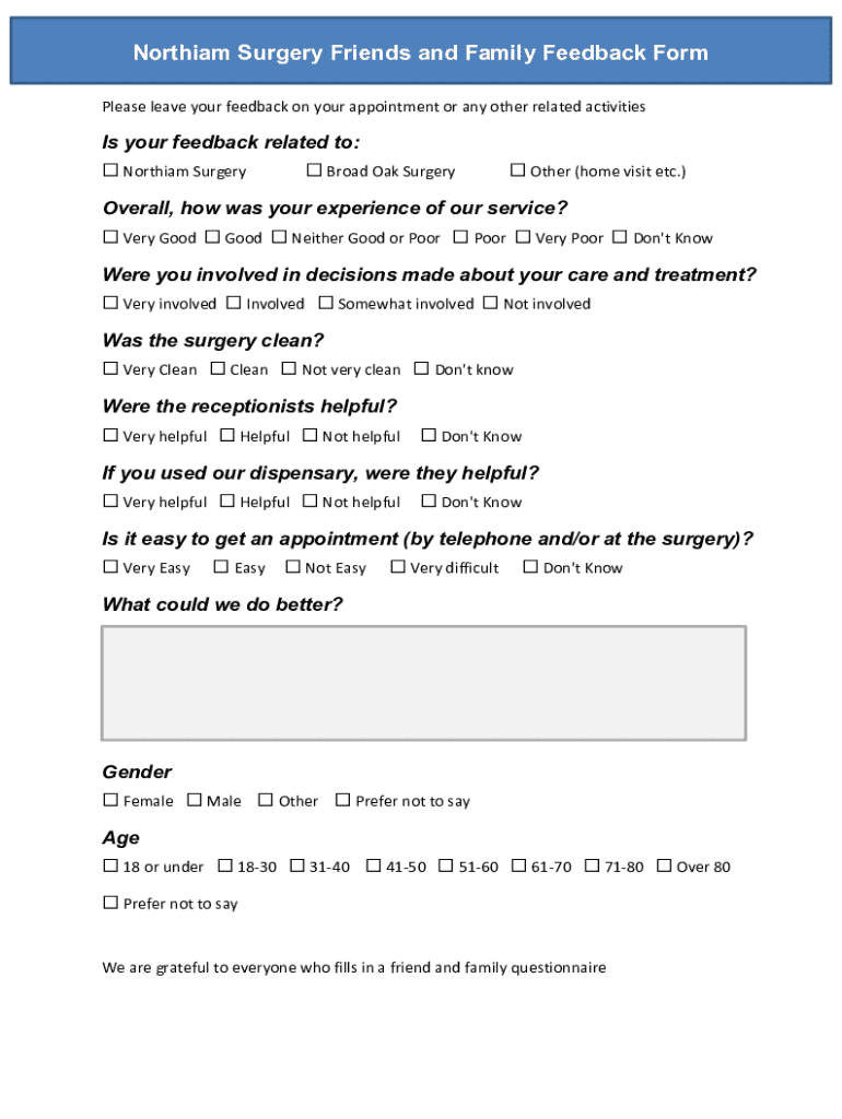 Northiam Surgery Friends and Family Feedback Form Please leave your feedback on your appointment or any other related activitiesIs your feedback related to:Northiam Surgery Broad Oak Surgery Other
