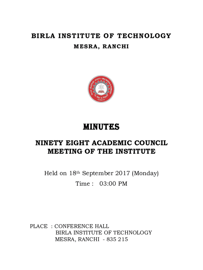BIRLA INSTITUTE OF TECHNOLOGY MESRA, RANCHIMINUTES NINETY EIGHT ACADEMIC COUNCIL MEETING OF THE INSTITUTE Held on 18th September 2017 (Monday) Time : 03:00 PMPLACE : CONFERENCE HALL BIRLA INSTITUTE