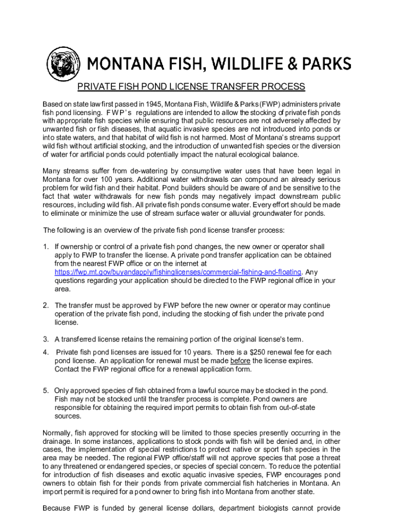 Get the free New law increases the costs of private pond licenses - fwp mt