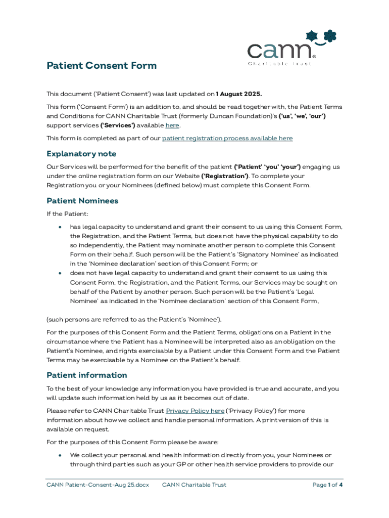 Patient Consent Form This document (Patient Consent) was last updated on 1 August 2025. This form (Consent Form) is an addition to, and should be read together with, the Patient Terms and Conditions