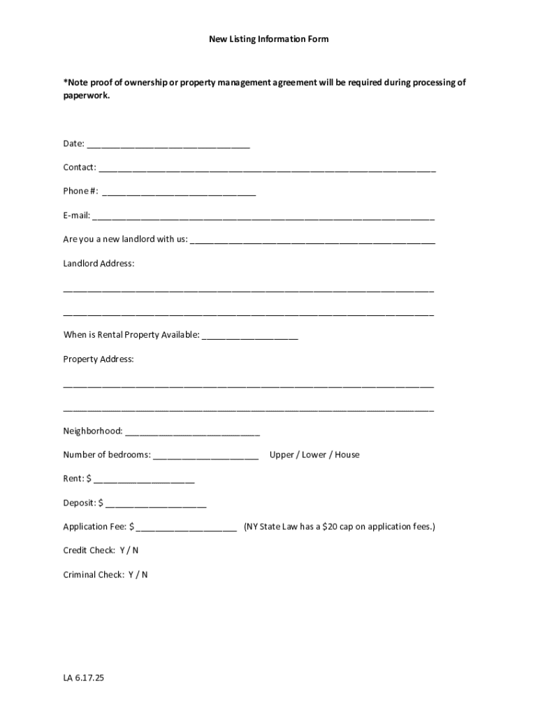 Get the free New Listing Information Form LA 6.17.25 *Note proof of ownership ...