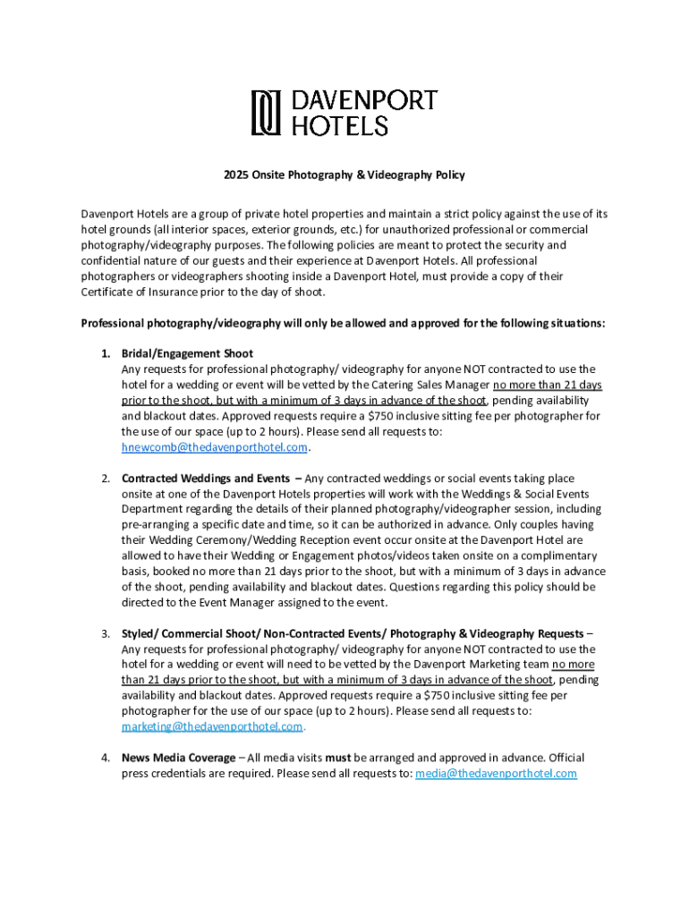 2025 Onsite Photography & Videography Policy Davenport Hotels are a group of private hotel properties and maintain a strict policy against the use of its hotel grounds (all interior spaces, exterior