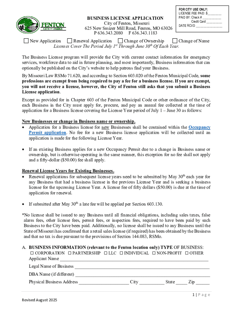 Get the free BUSINESS LICENSE APPLICATION City of Fenton, Missouri 625 ...