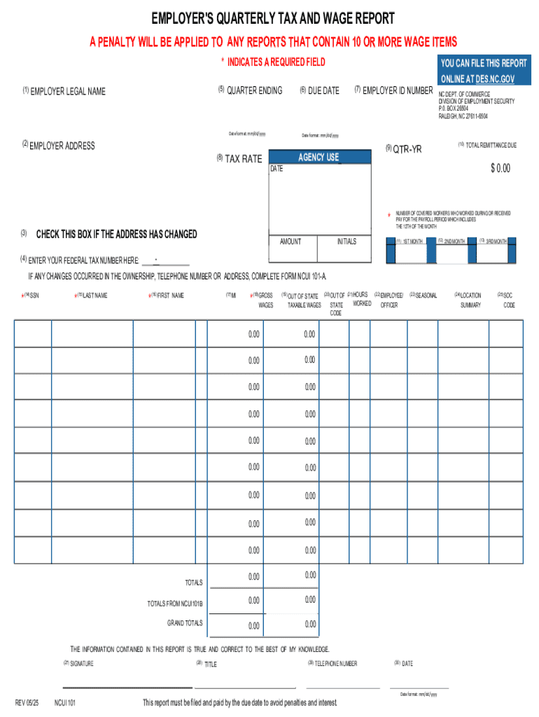 Employers who have employees working in North Carolina and are subject to unemployment insurance law are required to file Form NCUI-101.