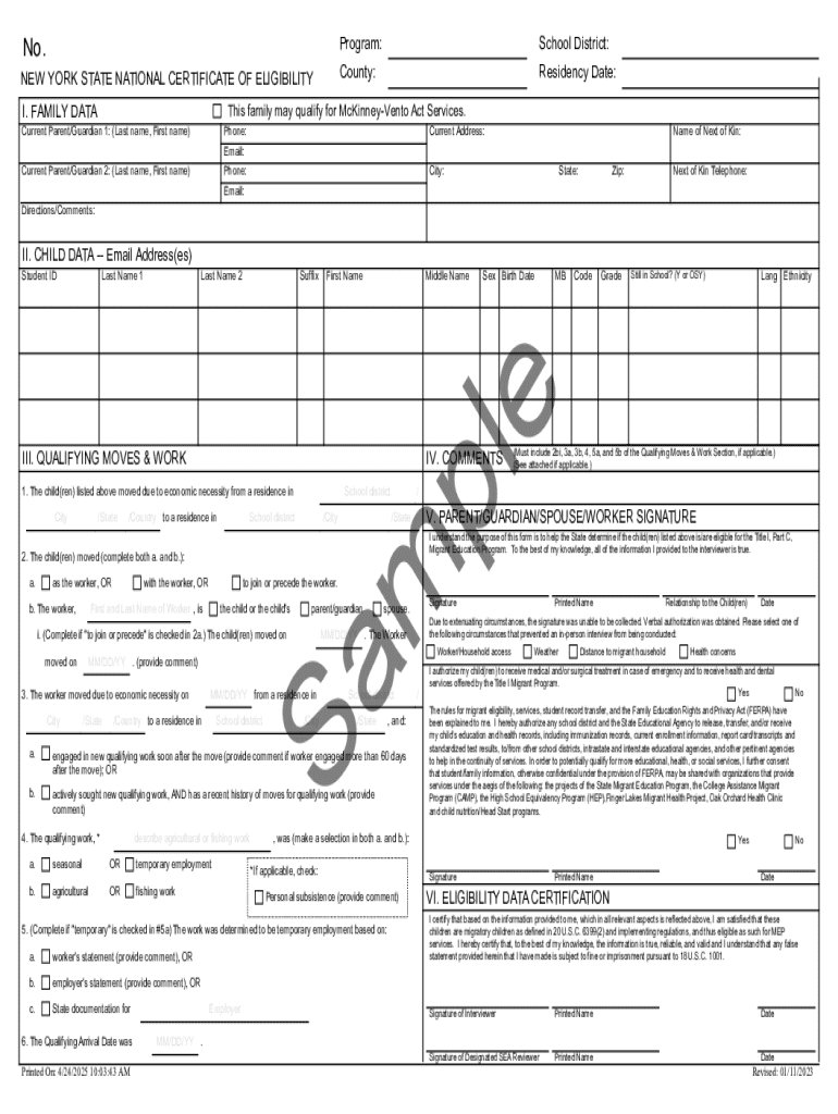 No.Program:School District:NEW YORK STATE NATIONAL CERTIFICATE OF ELIGIBILITYCounty:Residency Date:I. FAMILY DATAThis family may qualify for McKinneyVento Act Services.Current Parent/Guardian 1: (Last