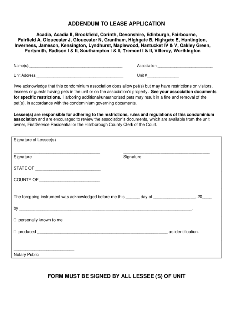 An addendum to lease application form is particularly vital in scenarios where the dynamics of the rental situation evolve. For instance, if a tenant acquires a pet after moving in, a pet policy addendum becomes necessary to outline the rules associated with having a pet on the premises.