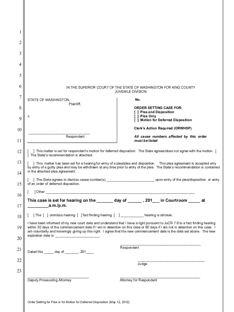 1 2 3 4 5 6 7IN THE SUPERIOR COURT OF THE STATE OF WASHINGTON FOR KING COUNTY JUVENILE DIVISION No.STATE OF WASHINGTON, Plaintiff,8 9ORDER SETTING CASE FOR: [ ] Plea and Disposition [ ] Plea Only