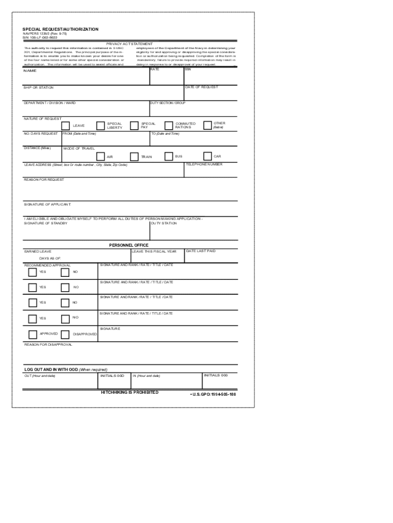 SPECIAL REQUEST/AUTHORIZATION NAVPERS 1336/3 (Rev. 975) SIN 106LF0638633 PRIVACY ACT STATEMENT The authority to request this information is contained in 5 USCemployees of the Department of the Navy
