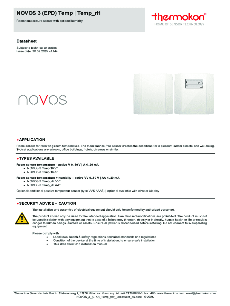NOVOS 3 (EPD) Temp | Temp_rH Room temperature sensor with optional humidityDatasheet Subject to technical alteration Issue date: 30.07.2025A144 APPLICATION Room sensor for recording room temperature.