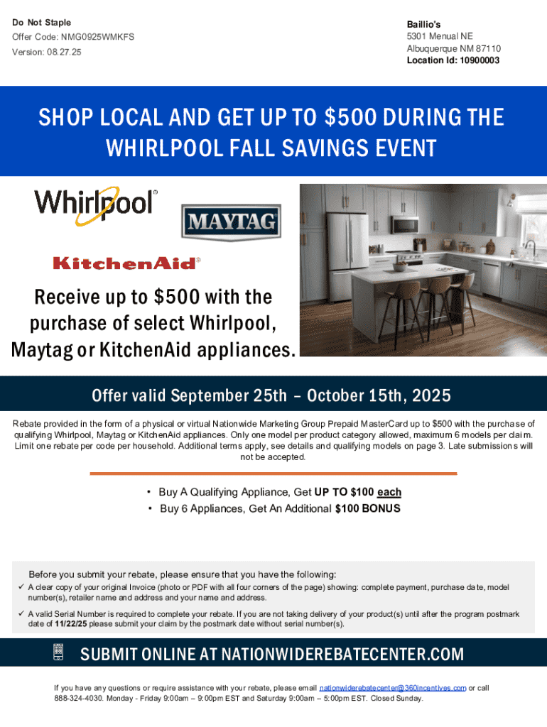 Do Not StapleBaillio\'s 5301 Menual NE Albuquerque NM 87110 Location Id: 10900003Offer Code: NMG0925WMKFS Version: 08.27.25SHOP LOCAL AND GET UP TO $500 DURING THE WHIRLPOOL FALL SAVINGS EVENTReceive