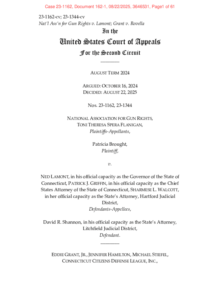 Case 231162, Document 1621, 08/22/2025, 3646531, Page1 of 61231162cv; 231344cv Natl Assn for Gun Rights v. Lamont; Grant v. RovellaIn theUnited States Court of Appeals For the Second Circuit ___ AUGUST