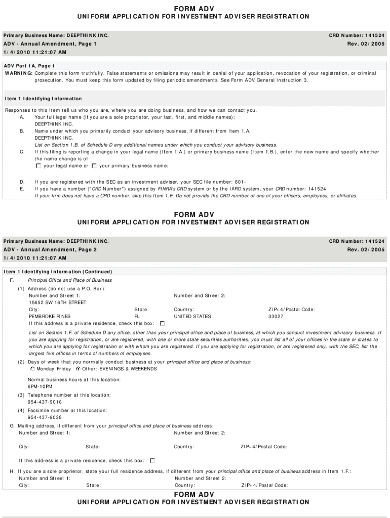 FORM ADV UNIFORM APPLICATION FOR INVESTMENT ADVISER REGISTRATION Primary Business Name: DEEPTHINK INC.CRD Number: 141524ADVAnnual Amendment, Page 1Rev. 02/20051/4/2010 11:21:07 AM ADV Part 1A, Page