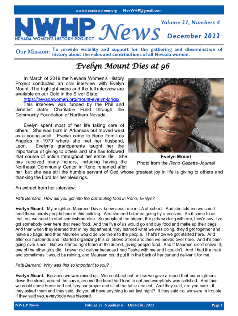 www.nevadawomen.orgNevWHP@gmail.comVolume 27, Numbers 4December 2022 provide visibility and support for the gathering and dissemination of Our Mission: To history about the roles and contributions