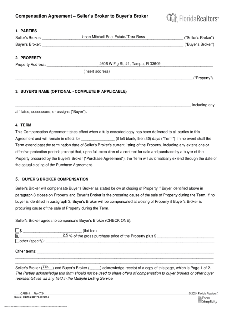 Compensation AgreementSeller\'s Broker to Buyer\'s Broker 1. PARTIES Jason Mitchell Real Estate/ Tara Ross Seller\'s Broker: ___ (\"Seller\'s Broker\") Buyer\'s Broker: ___ (\"Buyer\'s Broker\")2.