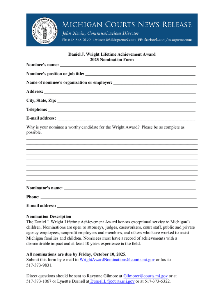 Get the free Nominations sought for Daniel J. Wright Lifetime ...