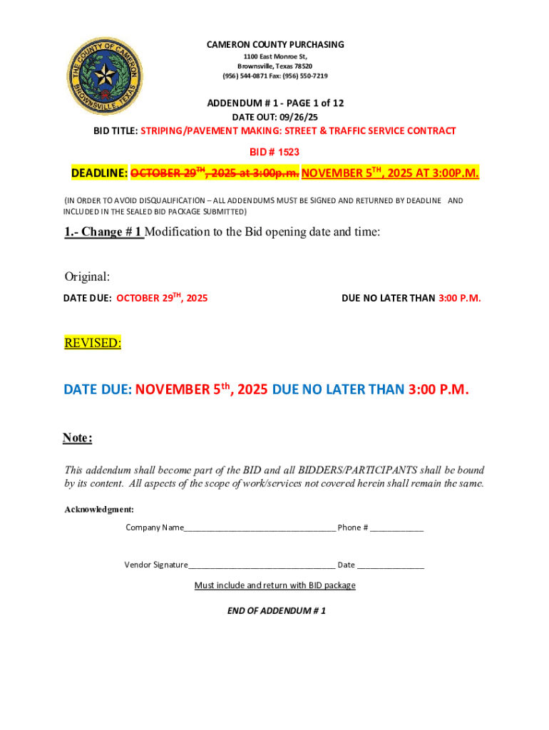 CAMERON COUNTY PURCHASING 1100 East Monroe St, Brownsville, Texas 78520 (956) 5440871 Fax: (956) 5507219ADDENDUM # 1PAGE 1 of 12 DATE OUT: 09/26/25BID TITLE: STRIPING/PAVEMENT MAKING: STREET & TRAFFIC