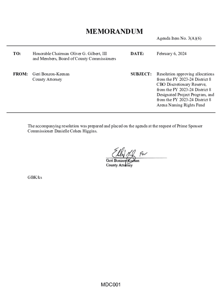 MEMORANDUMAgenda Item No. 3(A)(6)TO:Honorable Chairman Oliver G. Gilbert, III and Members, Board of County CommissionersDATE:February 6, 2024FROM:Geri BonzonKeenan County AttorneySUBJECT:Resolution