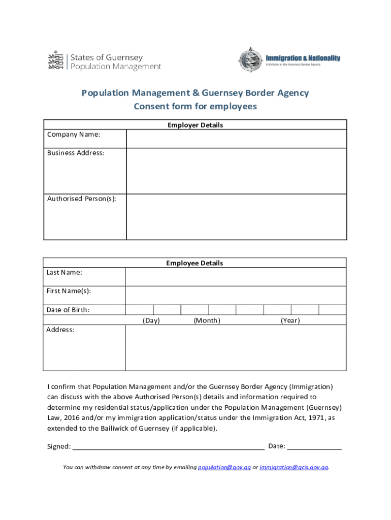 Population Management & Guernsey Border Agency Consent form for employees Employer Details Company Name: Business Address:Authorised Person(s):Employee Details Last Name: First Name(s): Date of Birth: