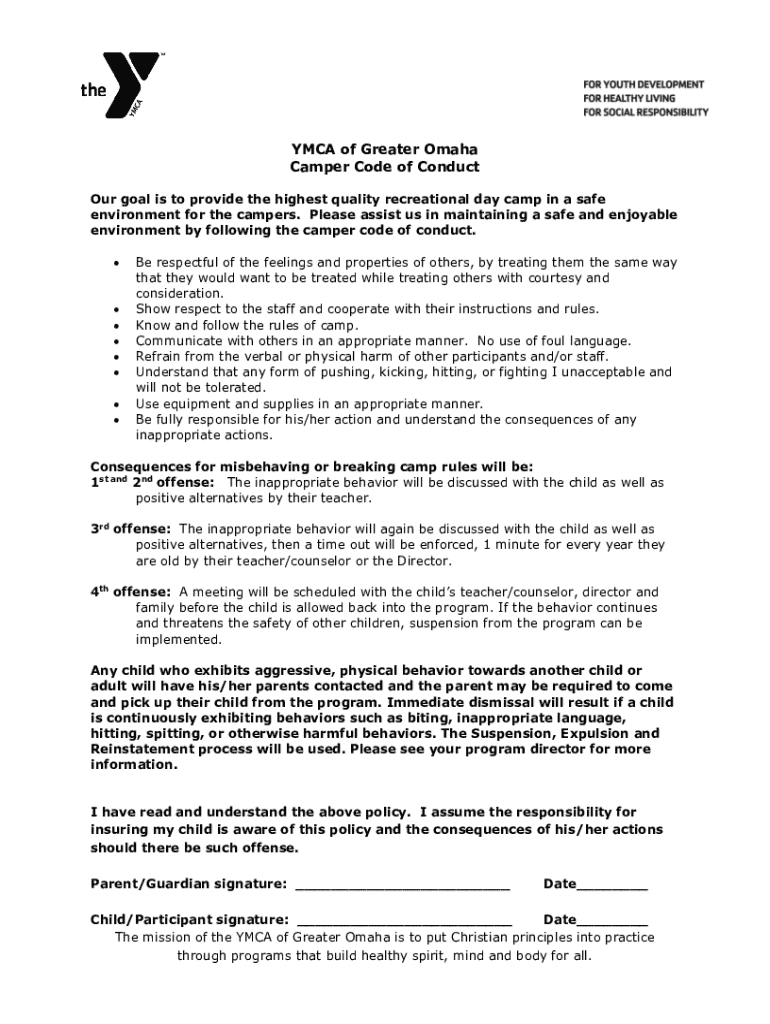 Get the free YMCA of Greater Omaha Camper Code of Conduct