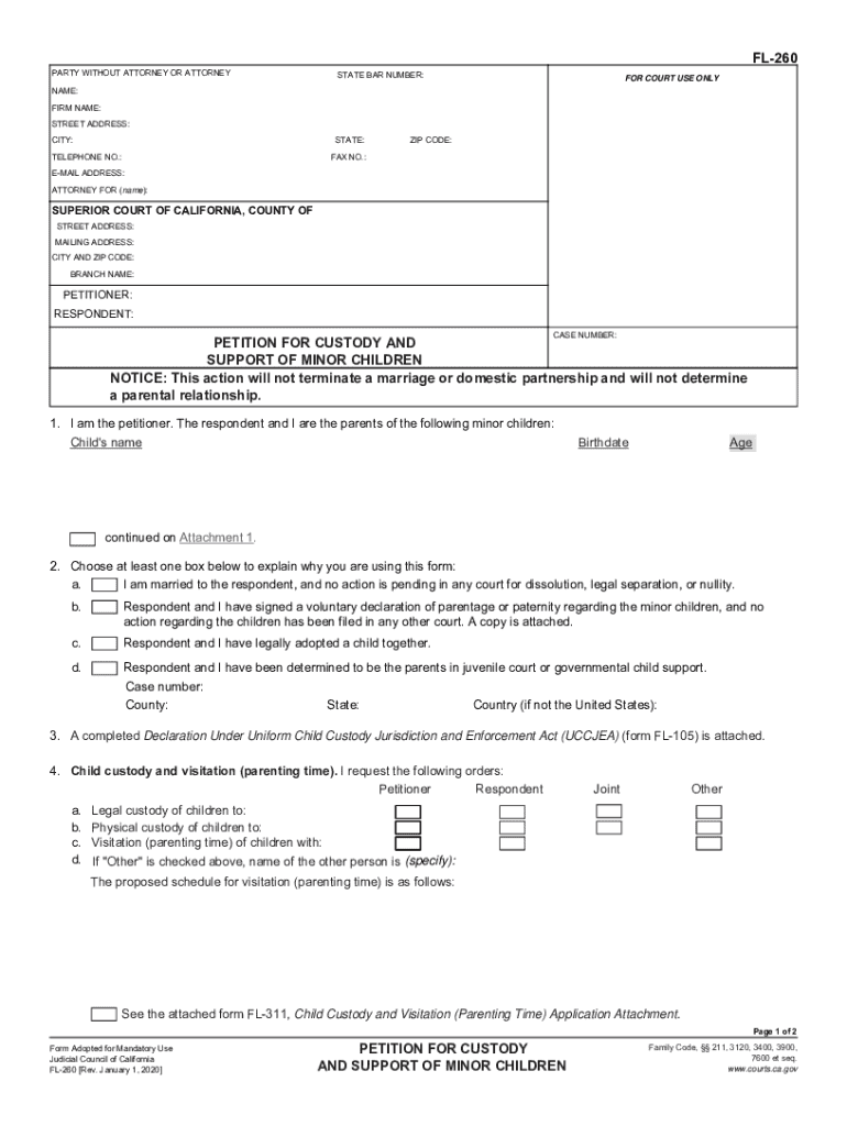 FL260 PARTY WITHOUT ATTORNEY OR ATTORNEYSTATE BAR NUMBER:FOR COURT USE ONLYNAME: FIRM NAME: STREET ADDRESS: CITY:STATE:TELEPHONE NO.:FAX NO.:ZIP CODE:EMAIL ADDRESS: ATTORNEY FOR (name):SUPERIOR COURT