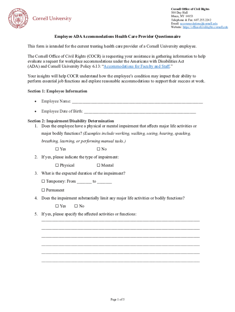 Cornell Office of Civil Rights 500 Day Hall Ithaca, NY 14853 Telephone & Fax: 607.255.2242 Email: accommodations@cornell.edu Website: https://officeofcivilrights.cornell.eduEmployee ADA Accommodations