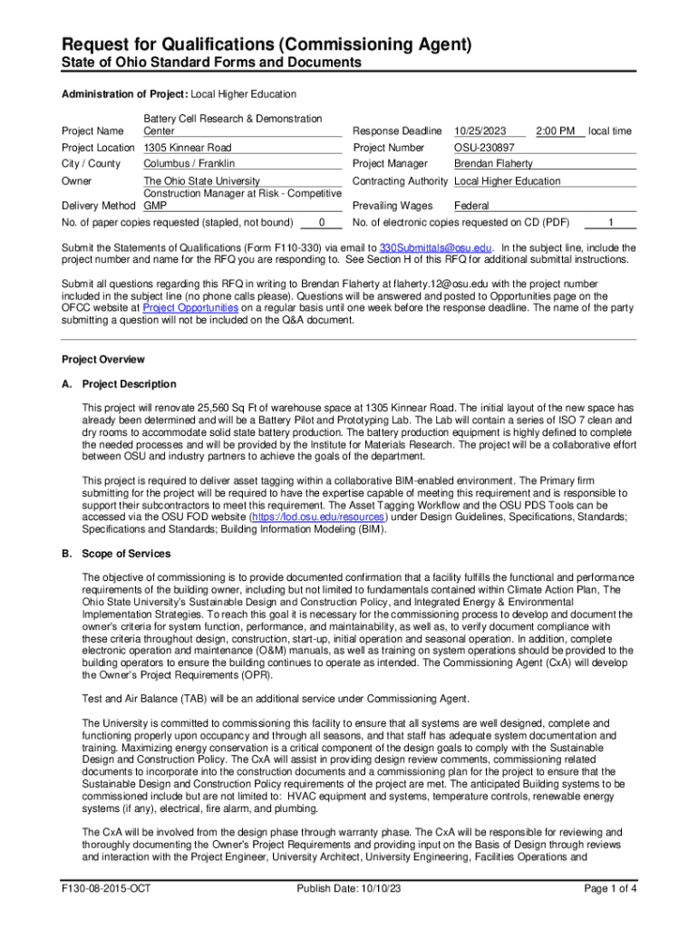 Request for Qualifications (Commissioning Agent) State of Ohio Standard Forms and Documents Administration of Project: Local Higher EducationProject NameBattery Cell Research & Demonstration CenterResponse