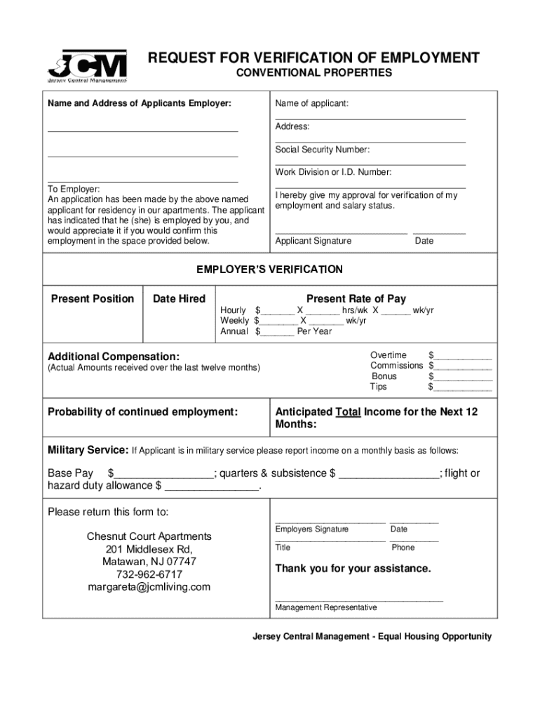 REQUEST FOR VERIFICATION OF EMPLOYMENT CONVENTIONAL PROPERTIES Name and Address of Applicants Employer:Name of applicant:___ Address:______ Social Security Number:______ Work Division or I.D. Number:___
