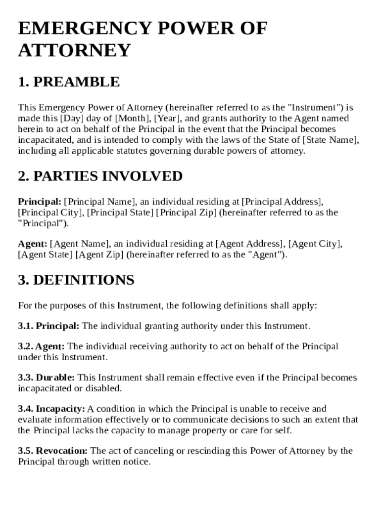 An emergency power of attorney (POA) is a legal document that allows an individual to designate someone to manage their affairs in urgent situations, such as sudden illness or incapacity. This document plays a vital role, enabling the agent to make decisions regarding health care, finances, and other significant matters on behalf of the principal.