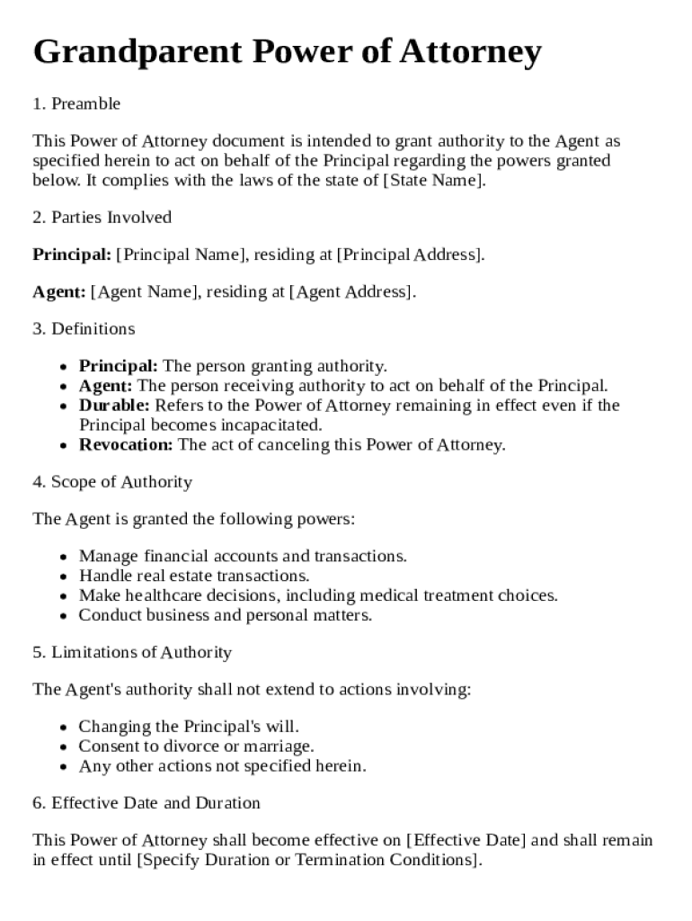 The grandparent may specify whether they grant authority for financial management, health care decisions, or broader real estate actions.