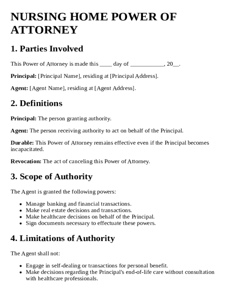 A nursing home power of attorney is a legal document that allows an individual, known as the agent, to make decisions on behalf of another person, referred to as the principal, in the context of nursing home care. It grants specific authority to manage financial matters and healthcare decisions, which is essential during nursing home admissions when patients may be unable to manage their affairs due to health issues.