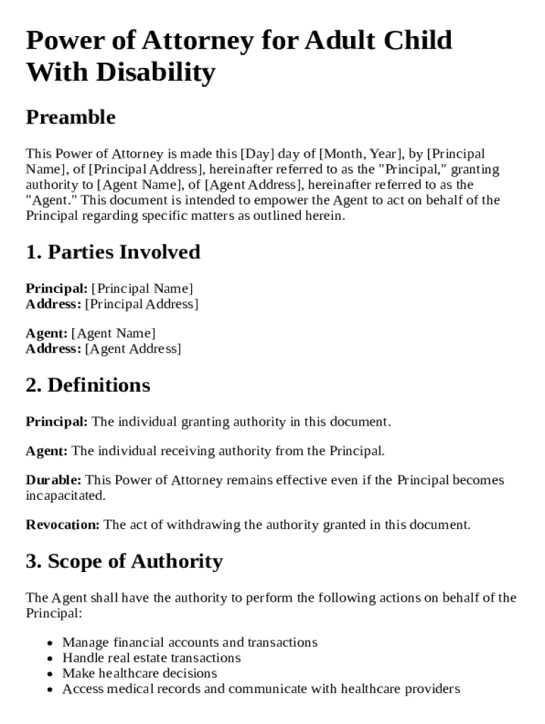 Get the free Power of Attorney for Adult Child With Disability Template