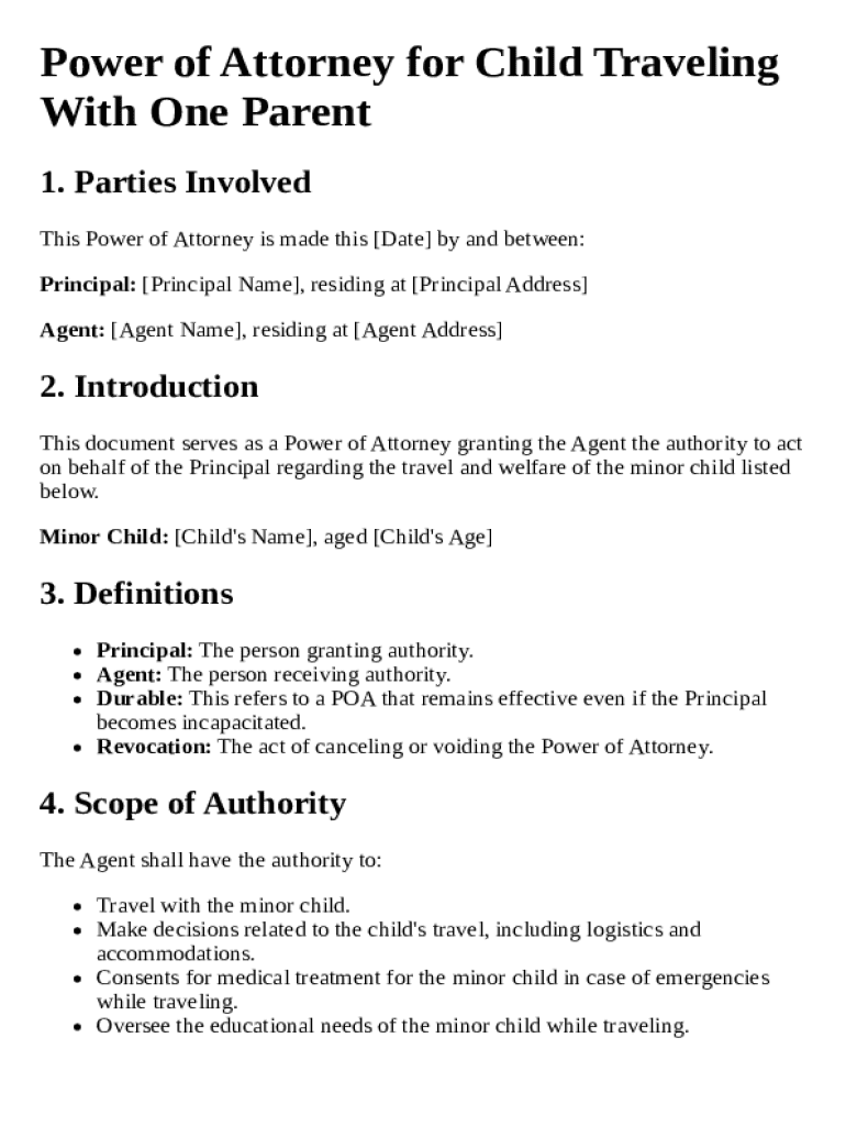 Get the free Power of Attorney for Child Traveling With One Parent Template