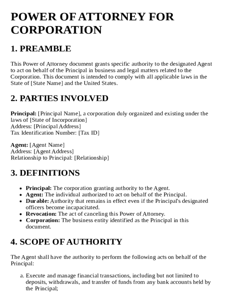 A Power of Attorney for Corporation Template is a legal document that authorizes a designated individual or entity to act on behalf of a corporation. This template is essential for ensuring that corporate decisions can be made by an appointed agent when necessary. By utilizing a Power of Attorney for Corporation Template, businesses can streamline their operations and maintain legal compliance.