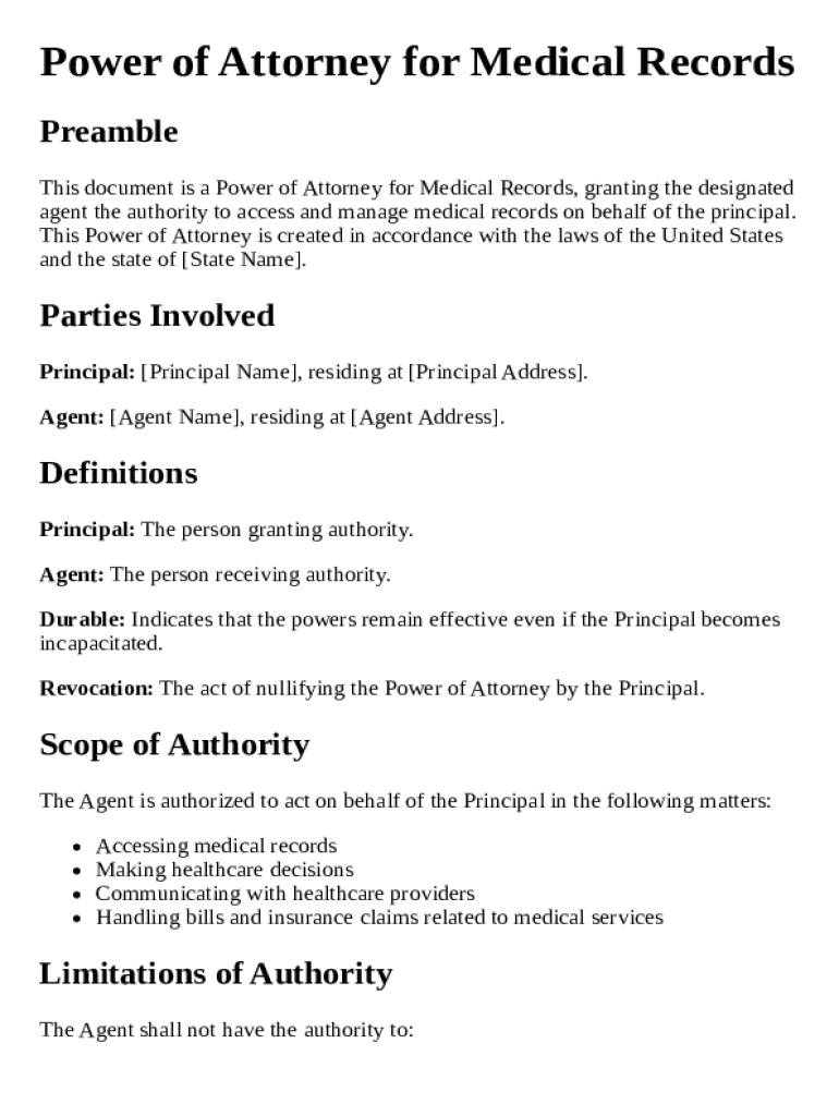A Power of Attorney (POA) is a legal document that grants one individual (the Agent) the authority to make decisions on behalf of another (the Principal) in specific areas, such as healthcare. This arrangement is vital in healthcare management, particularly in instances where the Principal is unable to communicate their wishes. There are several types relevant to medical records, including Health Care Power of Attorney, which specifically addresses healthcare decisions.