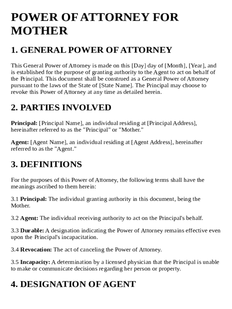 This document grants authority to an Agent to act on behalf of the Principal (Mother) in various matters including financial, real estate, healthcare, and legal decisions. It outlines the powers,
