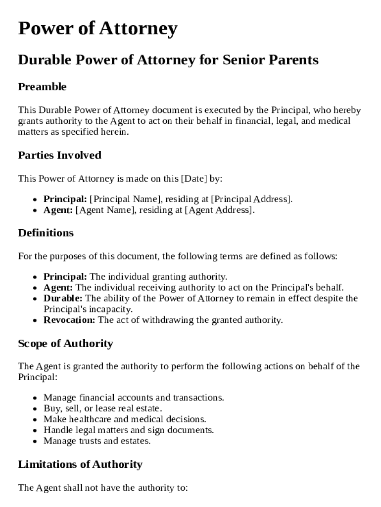 A properly executed Power of Attorney for Senior Parents Template is legally binding and enforceable in most jurisdictions. It’s crucial that the document is completed according to the laws applicable in your state, which may include requirements for signatures and witnesses. By using a well-structured template and adhering to legal guidelines, families can ensure that the document holds up in legal situations where it’s needed.