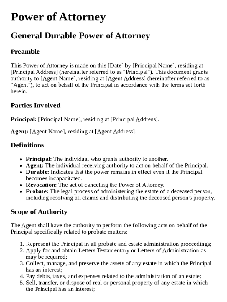 A probate power of attorney is a legal document that grants an agent authority to manage the financial and legal affairs of an individual upon their incapacity or death.