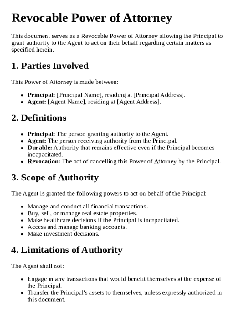 A revocable power of attorney is a legal document that allows an individual, known as the principal, to grant authority to another person, called the agent, to act on their behalf in a variety of matters. This document can be modified or revoked by the principal at any time, which is what distinguishes it from a durable power of attorney, that remains effective even if the principal becomes incapacitated. Understanding the significance of having a revocable power of attorney is crucial for effective personal and financial management.