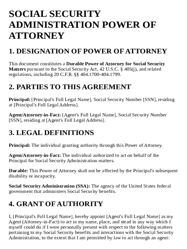 The Social Security Administration power is a legal document that authorizes someone to act on behalf of an individual in matters related to Social Security benefits and programs.