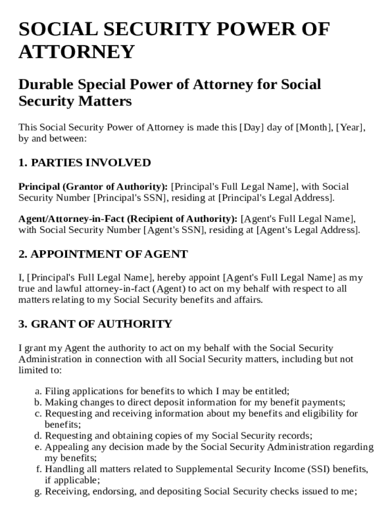 This document appoints an agent to manage Social Security matters for the principal, granting authority to act on behalf of the principal regarding benefits and related affairs.