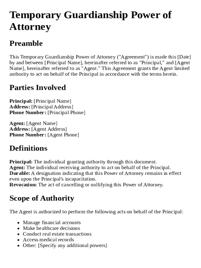 When drafting the temporary guardianship power of form, it is vital to define the scope of authority granted to the agent. It must specify what powers are bestowed upon them, such as making healthcare decisions or managing finances.