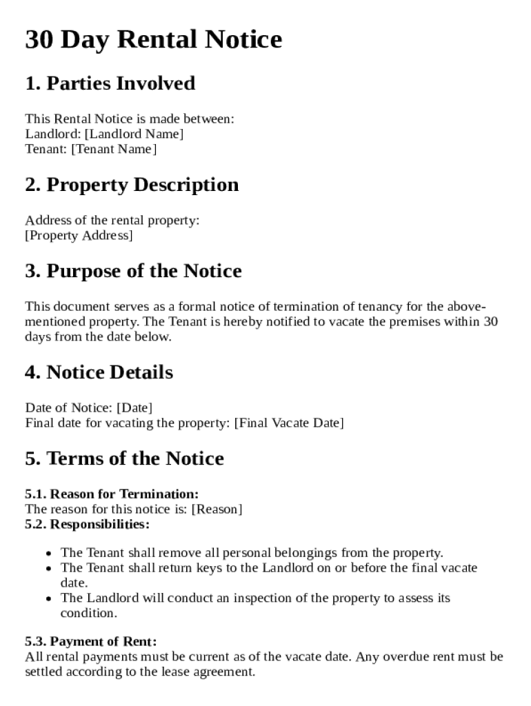 A 30-day rental notice is a formal communication from either a landlord or a tenant that indicates the intention to terminate a rental agreement with 30 days’ notice. This notice is crucial as it helps maintain transparency in landlord-tenant relationships and sets an official timeline for vacating the premises.