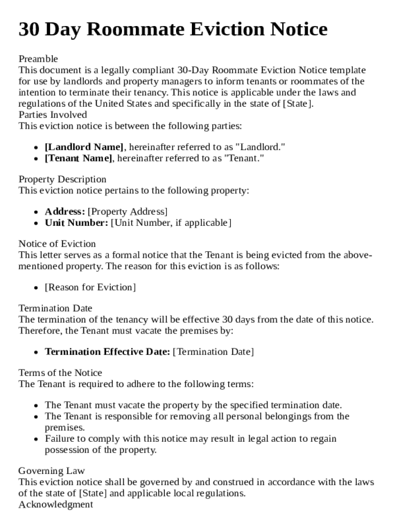 A 30 day roommate eviction is a legal notice informing a tenant that they must vacate the premises within 30 days.