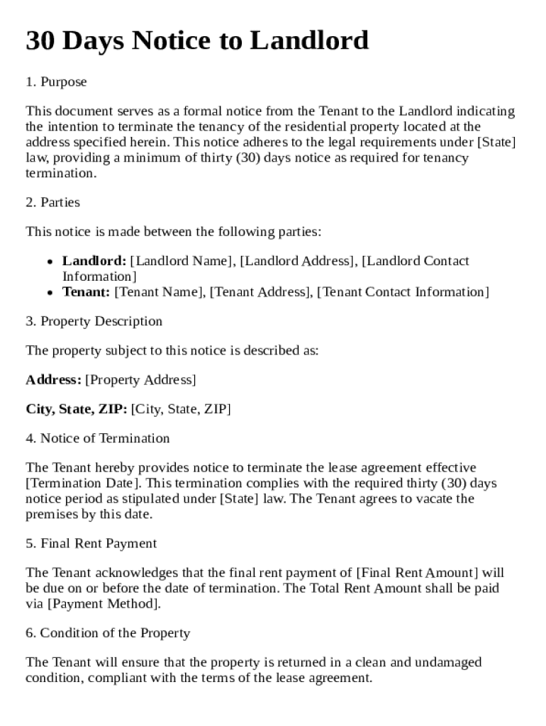 A well-structured 30-day notice encompasses several critical components to ensure clarity and legal compliance. These elements serve as a checklist for both landlords and tenants to follow when preparing the document.