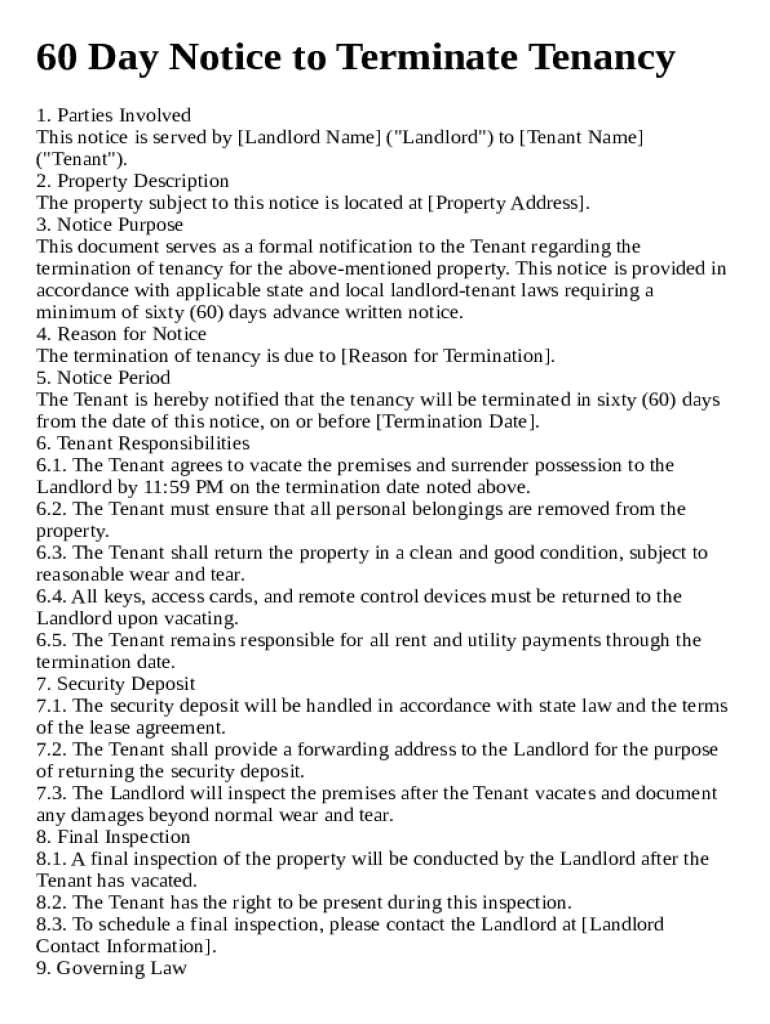 A 60-day notice is a formal document used to inform tenants or landlords of the intention to terminate a rental agreement or lease, effective in 60 days.